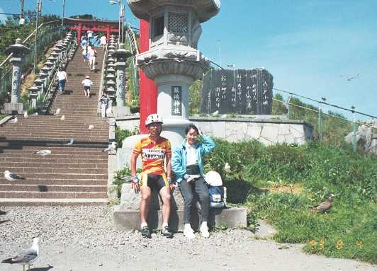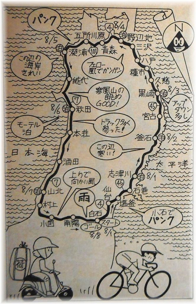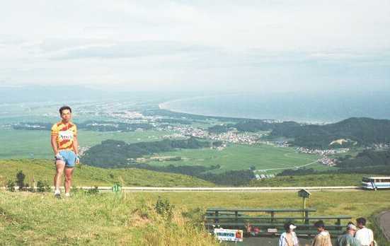 6日目晴天無風。海岸線はとても美しくクルマも坂も少なく、気分ソウ快。まずは十二湖を見学する。日本キャニオンは期待したほどではなかった。R101を南下して秋田県入り。県境付近の海岸線は、特にきれいであった。八郎潟で道を間違え、干拓地を横断することになる。広くて長く、走りがいがあった。ここばかりはミントの後を走らせてもらう(つまりこれまではずっと、自転車が前を走っていた)寒風山に寄ってみたが、3kmの上りはかなりの勾配で、自転車もミントもやっとこさ上りきった。360度の眺めは最高!秋田市内に泊まろうとしたところ「竿灯祭り」のため宿が取れず、ついにモ-テル泊まりとなり2人で一泊5200円。今回の旅中いちばん安かったが落ち着かず、熟睡できず、参った!